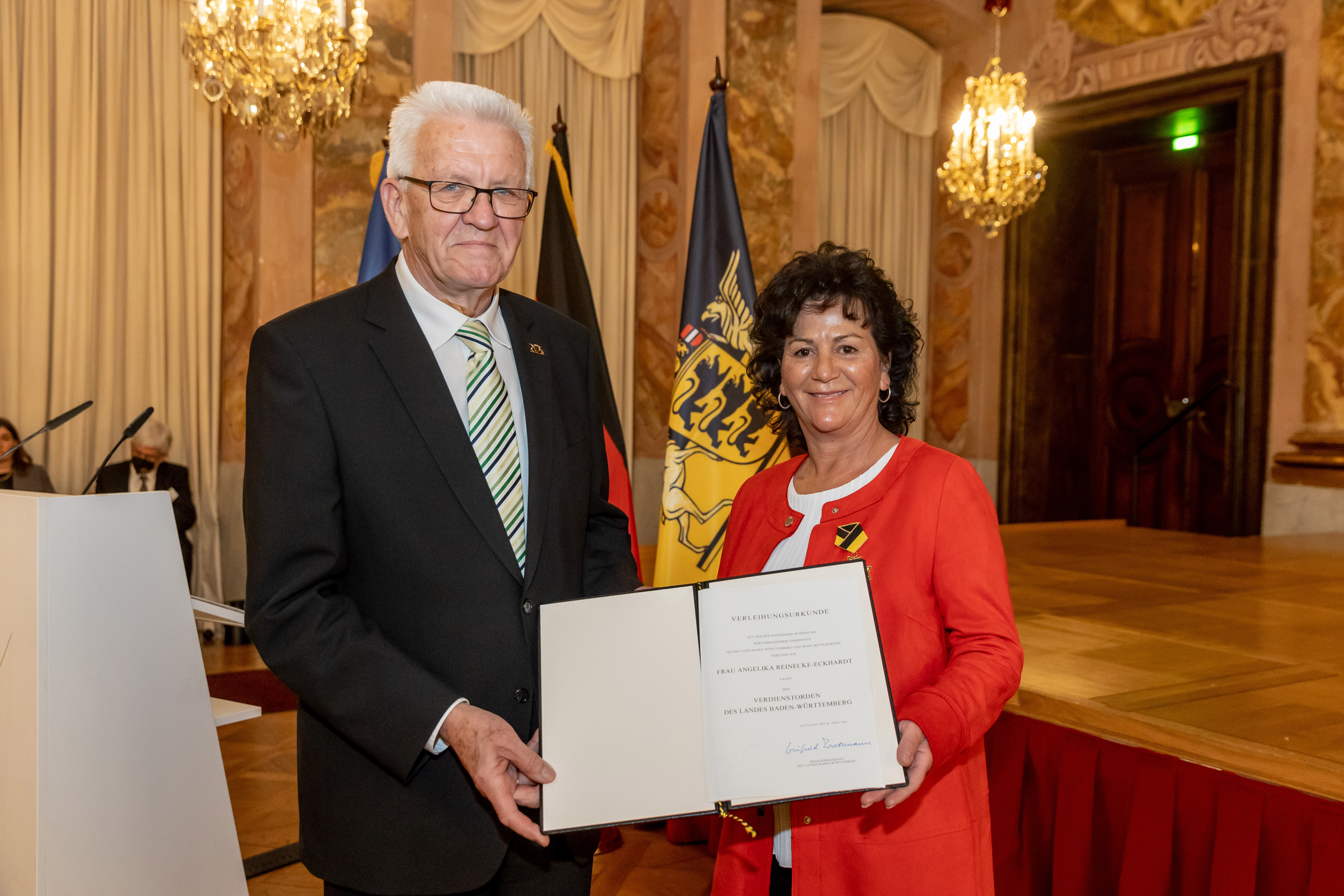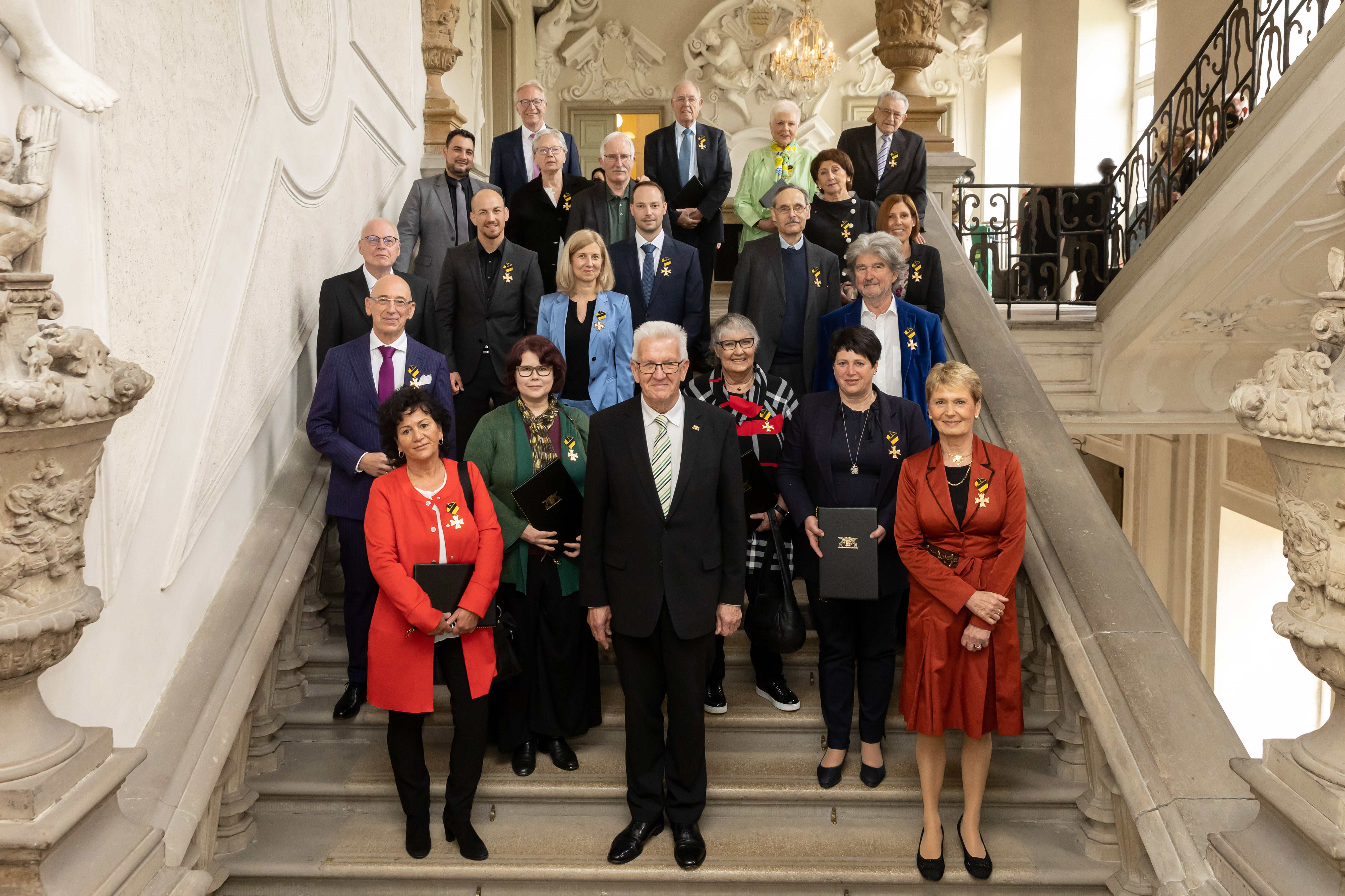 Für herausragende Verdienste um das Land und seine Bevölkerung hat Ministerpräsident Winfried Kretschmann den Verdienstorden des Landes Baden-Württemberg an 21 verdiente Persönlichkeiten verliehen. Ein demokratisches Gemeinwesen lebt vom Engagement der Bürgerinnen und Bürger.