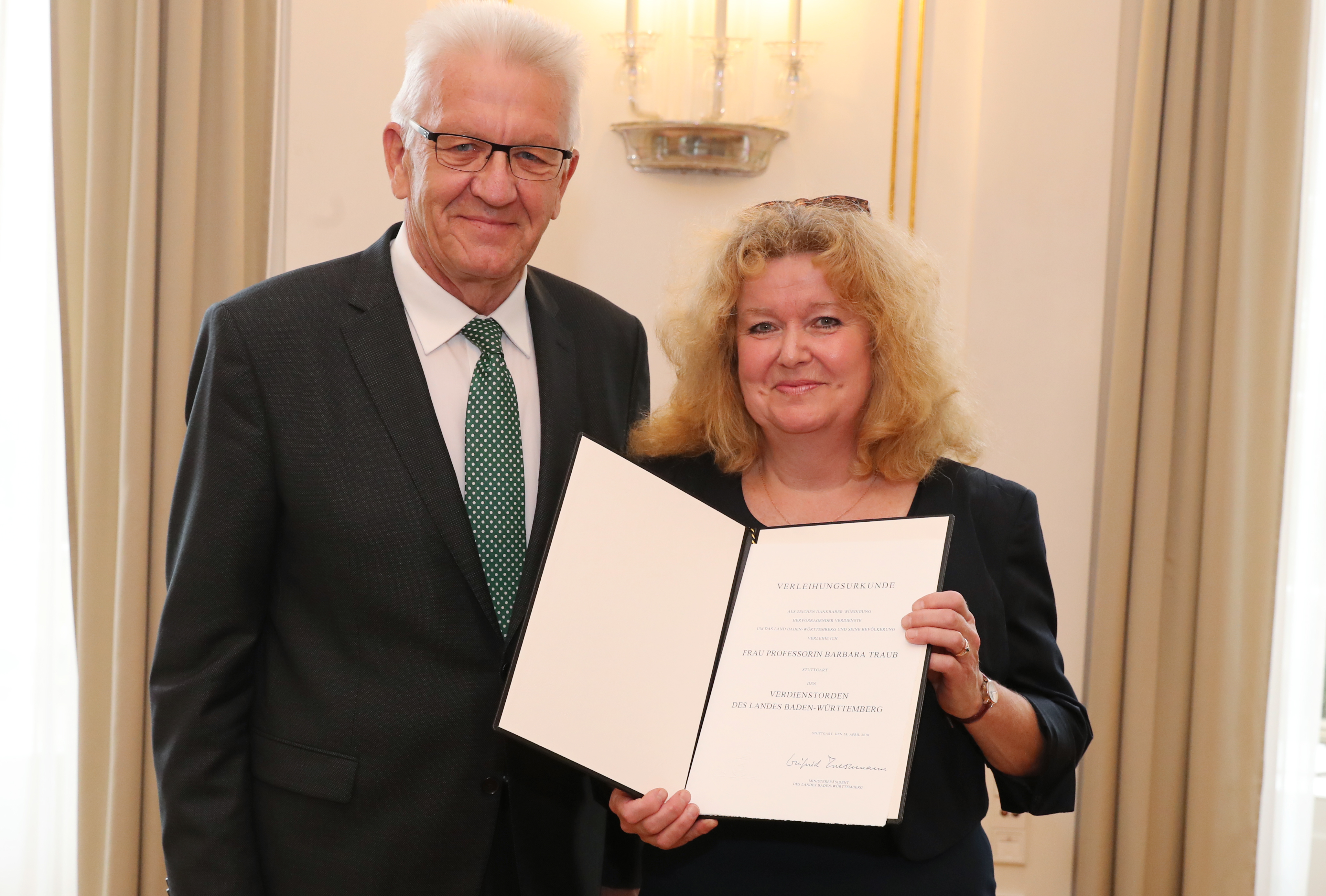 Ministerpräsident Winfried Kretschmann hat der Vorstandsvorsitzenden der Israelitischen Religionsgemeinschaft Württembergs, Professorin Barbara Traub, den Verdienstorden des Landes Baden-Württemberg überreicht und ihr Engagement gegen wachsenden Rassismus, Antisemitismus und religiösen Fanatismus gewürdigt.