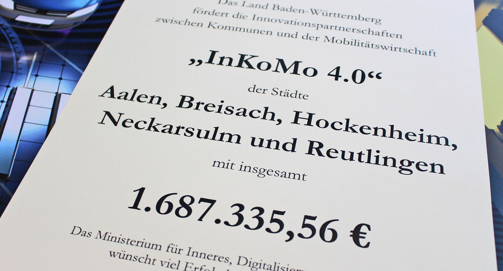Durch das Förderprogramm InKoMo 4.0 (Innovationspartnerschaften zwischen Kommunen und der Mobilitätswirtschaft 4.0) sollen bereits erfolgreich erprobte digitale Mobilitätslösungen verbessert und auf weitere Regionen übertragen werden. Ausgezeichnet werden die Städte Aalen, Breisach, Hockenheim, Neckarsulm und Reutlingen. Sie werden dabei unterstützt, Produkte und Dienste insbesondere zur vernetzten Verkehrssteuerung und zum automatisierten Fahren voranzubringen. Die fünf aktuell bewilligten InKoMo-Förderanträge haben ein Volumen von insgesamt 1,7 Millionen Euro. Die Vorhaben sind auf drei Jahre angelegt und werden von einer eigens eingerichteten Geschäftsstelle beim Städtetag Baden-Württemberg begleitet.