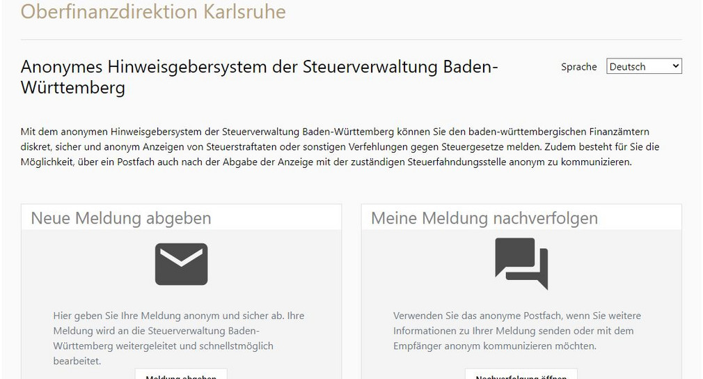 Die baden-württembergische Steuerverwaltung führt das bundesweit erste anonyme Hinweisgebersystem für Finanzämter ein. Das neue Hinweisgeberportal bietet Bürgerinnen und Bürgern einen sicheren und anonymen Kommunikationsweg, um Verstöße gegen Straf- und Steuergesetze anzuzeigen.