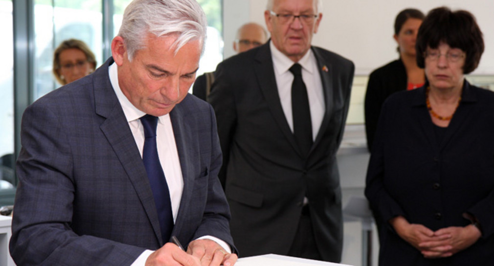 Der stellvertretende Ministerpräsident Thomas Strobl trug sich gemeinsam mit Ministerpräsident Winfried Kretschmann im französischen Generalkonsulat in das ausliegende Kondolenzbuch ein.