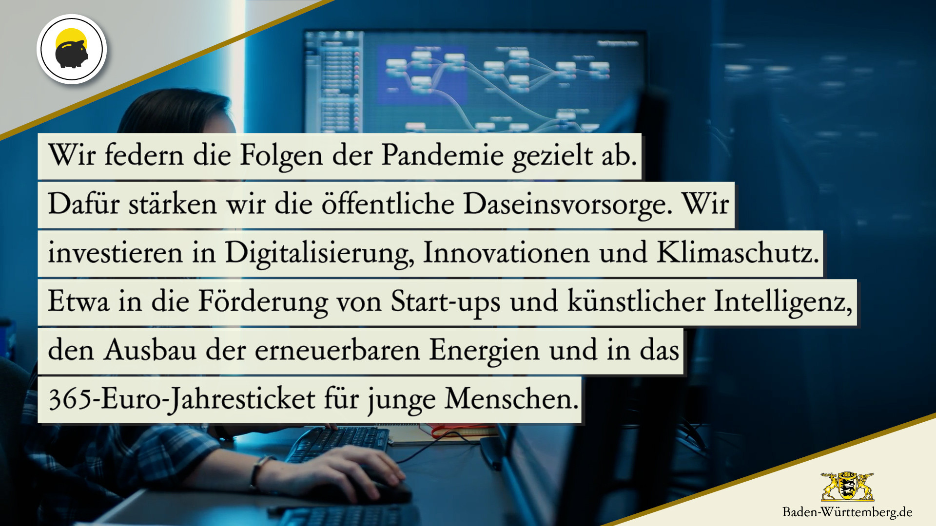 „Daneben werden wir gezielt in Digitalisierung, Innovationen und Klimaschutz investieren, wie etwa in die Förderung von Start-Ups und künstlicher Intelligenz, in den Ausbau der Erneuerbaren und in nachhaltige Mobilität gerade für junge Menschen mit dem 365-Euro-Jahresticket“, sagte Minister Dr. Bayaz.