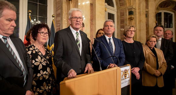 Ministerpräsident Winfried Kretschmann und Ehefrau Gerlinde mit den Mitgliedern des Kabinetts (r.) vor den Gästen