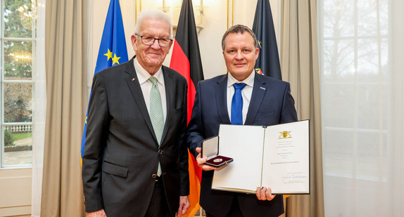 Sozialminister Manne Lucha hat Monika Barz für ihr außergewöhnliches Engagement für gleiche Rechte und Toleranz gegenüber Lesben und Schwulen das Bundesverdienstkreuz überreicht.