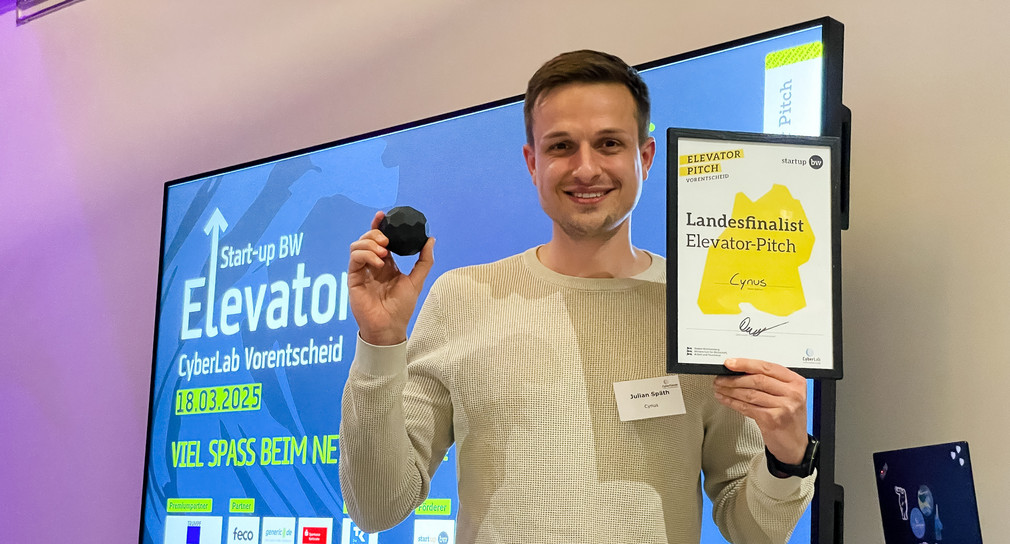 Mit dem Gründungswettbewerb „Start-up BW Elevator Pitch“ sucht das Ministerium für Wirtschaft, Arbeit und Tourismus bereits zum elften Mal nach den einfallsreichsten Geschäftsideen und besten Gründerinnen und Gründern im Land. Dafür finden in ganz Baden-Württemberg Vorentscheide für das Landesfinale statt, die eigenverantwortlich durch die Partner organisiert werden. Der CyberLab-Vorentscheid fand am 18. März 2025 statt. Das Team Cynus überzeugte mit seiner Geschäftsidee SphereOne, einer innovativen 3D-Maus, die durch intuitive Gestensteuerung und flexible Konfigurationsmöglichkeiten die Produktivität steigert und ergonomisches Arbeiten fördert, die Jury und zieht ins Landesfinale 2025 ein.