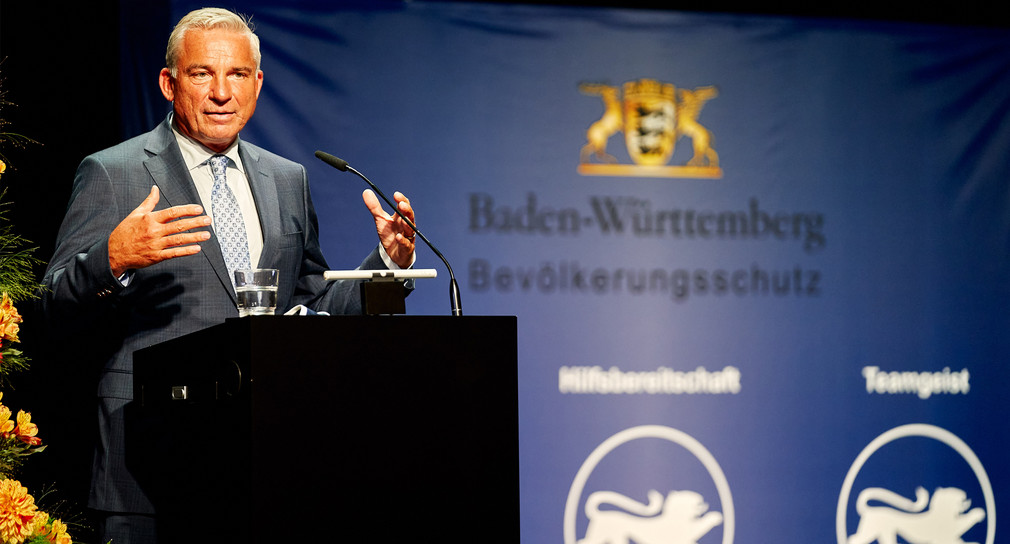 „Ob Naturkatastrophen, Brände, Verkehrsunfälle oder sonstige Schadenslagen, ohne unsere Ehrenamtlichen wäre das nicht zu bewältigen. Freilich bedürfen die ehrenamtlich im Bevölkerungsschutz Engagierten der Unterstützung durch uns, den Staat, die Bürgerschaft in der Fläche unseres Landes und ganz besonders auch der Arbeitgeber. Dass Arbeitgeber ihre Mitarbeiterinnen und Mitarbeiter zu jeder Zeit in den Einsatz gehen lassen, das ist sehr lobenswert, das ist nicht selbstverständlich, das ist Ausdruck unserer Gemeinschaft und Verantwortung untereinander – und das geht nur Hand in Hand“, sagte der stellvertretende Ministerpräsident und Innenminister Thomas Strobl.