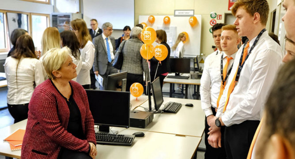 Das Tagesprogramm der Ministerin beginnt am Vormittag mit einem Besuch der Kaufmännischen Schule Lahr. Bei einem Rundgang stellt Schulleiter Herbert Huber der Kultusministerin das Profil der Schule vor. Die Kaufmännische Schule mit integriertem beruflichem Gymnasium beteiligt sich beispielsweise am Tabletprojekt des Landes „tabletBS“ für Schülerinnen und Schüler des Wirtschaftsgymnasiums und des Sozialwissenschaftlichen Gymnasiums. Außerdem können die Schülerinnen und Schüler in neun Übungsfirmen berufspraktische Kenntnisse und Fertigkeiten erwerben. Während des Rundgangs besucht Eisenmann die Gründungsversammlung einer neuen Übungsfirma der zweijährigen Berufsfachschule und schaut sich eine Unterrichtssequenz in einer Klasse des dualen kaufmännischen Berufskollegs mit internationalem Wirtschaftsmanagement und Fremdsprachen an. Der Bildungsgang richtet sich speziell an Abiturientinnen und Abiturienten, die eine Ausbildung zur Industrie- oder Großhandelskauffrau – beziehungsweise Kaufmann – absolvieren. Im Anschluss führt die Ministerin ein Gespräch mit der Schulleitung und Lehrkräften des Kollegiums unter anderem über den Umgang mit Heterogenität an der beruflichen Schule und die Vernetzung mit den allgemein bildenden Schulen in der Region bei der Berufsorientierung.