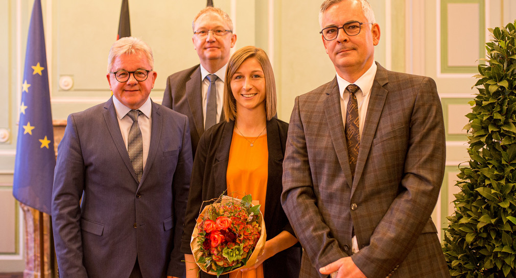 Besonders ehrten Minister Wolf sowie der Rektor der Hochschule für Rechtspflege Schwetzingen, Frank Haarer, und Prorektor Rainer Hock, die Jahrgangsbeste Theresa Badstuber aus Ebersbach-Musbach (Landkreis Ravensburg). Sie erreichte die exzellente Abschlussnote von 11,19 Punkten.
