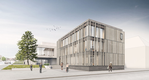 Der dreigeschossige Erweiterungsbau verlängert das bestehende Gebäude des Amtsgerichts aus den 1960er Jahren. Der Neubau nimmt die Straßenflucht der benachbarten Bebauung auf, gleichzeitig bleibt der Blick auf das charaktervolle Bestandsgebäude erhalten. Die Gebäudehülle wird hochwärmegedämmt im Passivhausstandard errichtet. Die Freianlagen um das Bestandsgebäude und den Erweiterungsbau werden im Zuge der Sanierung und Erweiterung neu hergestellt. Öffentliche Zugänge, Parkierungsflächen und eine Bushaltestelle werden in die Außenanlagengestaltung integriert. Das Erscheinungsbild des Erweiterungsbaus ist geprägt von einer Holzfassade mit vertikalen Holzlamellen aus Weißtanne. Die Fertigstellung wird für Ende 2022 angestrebt.