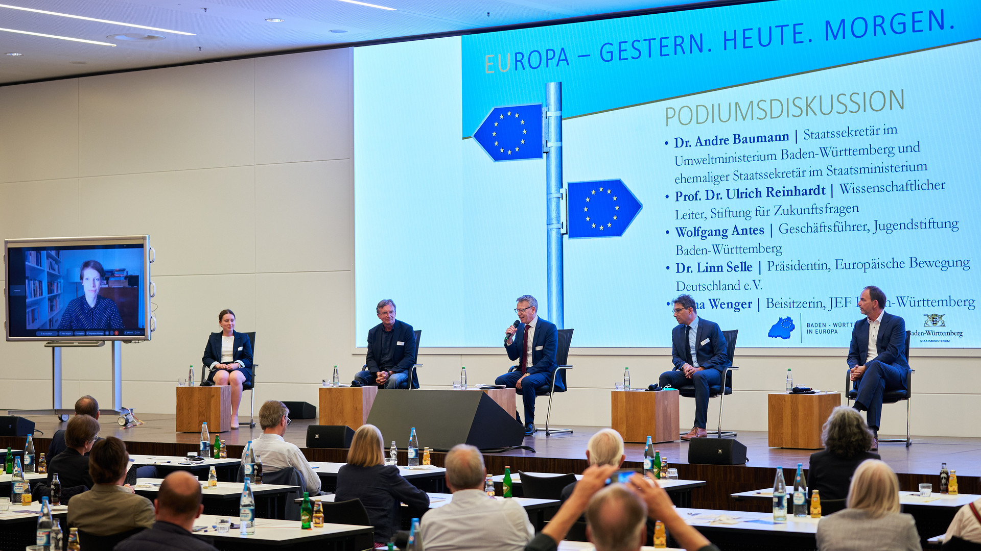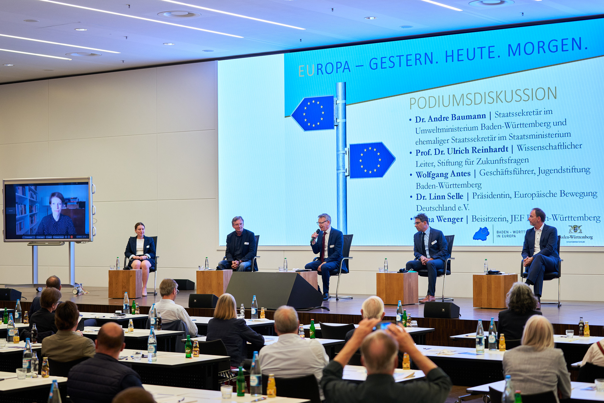 Im Rahmen der heutigen Diskussionsrunde sprach Staatssekretär Dr. Baumann mit dem Zukunftsforscher Prof. Dr. Ulrich Reinhardt, der Präsidentin der Europäischen Bewegung Deutschland, Dr. Linn Selle, dem Geschäftsführer der Jugendstiftung Baden-Württemberg, Wolfgang Antes und der Beisitzerin im Landesvorstand der Jungen Europäer – JEF Baden-Württemberg, Alina Wenger. Sie tauschten sich über ihre Visionen zur Zukunft Europas aus und diskutierten, wie Europa noch mehr zu einem Gemeinschaftsprojekt aller Europäerinnen und Europäer gemacht werden könne.