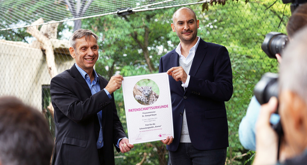Finanzminister Dr. Danyal Bayaz hat bei seinem ersten Besuch in der Wilhelma die Patenschaft für die kleine Schneeleopardin „Karma“ übernommen. Das Jungtier war am 11. April mit seinen Schwestern „Dawa“ und „Nyima“ als Drilling im Zoologisch-Botanischen Garten in Stuttgart zur Welt gekommen. Finanzminister Dr. Bayaz sagte: „Die Bilder der kleinen Schneeleoparden haben mich sofort verzaubert, das sind faszinierende Tiere. Schneeleoparden sind in ihrer Existenz gefährdet, die Wilhelma sichert ihren Bestand, wie bei vielen anderen hochbedrohten Tierarten auch.“