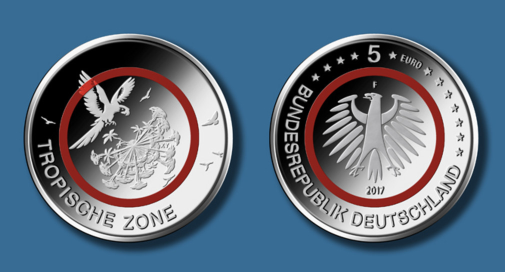 Finanzministerin Edith Sitzmann hat in Karlsruhe die erste 5-Euro-Münze mit dem Motiv „Tropische Zone“ geprägt. Die Münze zeichnet sich durch einen lichtdurchlässigen roten Polymerring aus und ist der Auftakt der vom Bundesministerium der Finanzen herausgegebenen 5-Jahres-Serie „Klimazonen der Erde“.