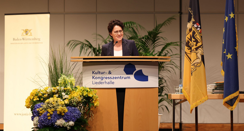 Die Ministerin der Justiz und für Migration, Marion Gentges, hat am 20. Mai 2022 im Hegel-Saal der Stuttgarter Liederhalle den Absolventinnen und Absolventen zum bestandenen Zweiten Juristischen Staatsexamen gratuliert und dabei auch die Herausforderungen, die die Pandemie für alle mit sich brachte, hervorgehoben: „Mit dem erfolgreichen Abschluss der Zweiten Juristischen Staatsprüfung haben Sie – allen Widrigkeiten zum Trotz – nicht nur gezeigt, dass Sie digitales Studieren können, dass Sie Flexibilität, Kreativität und Selbständigkeit können, sondern Sie haben auch eindrucksvoll unter Beweis gestellt, dass Sie eine Krise als Chance zum Wandel begreifen. All dies hat Ihnen die Pandemie abverlangt“.