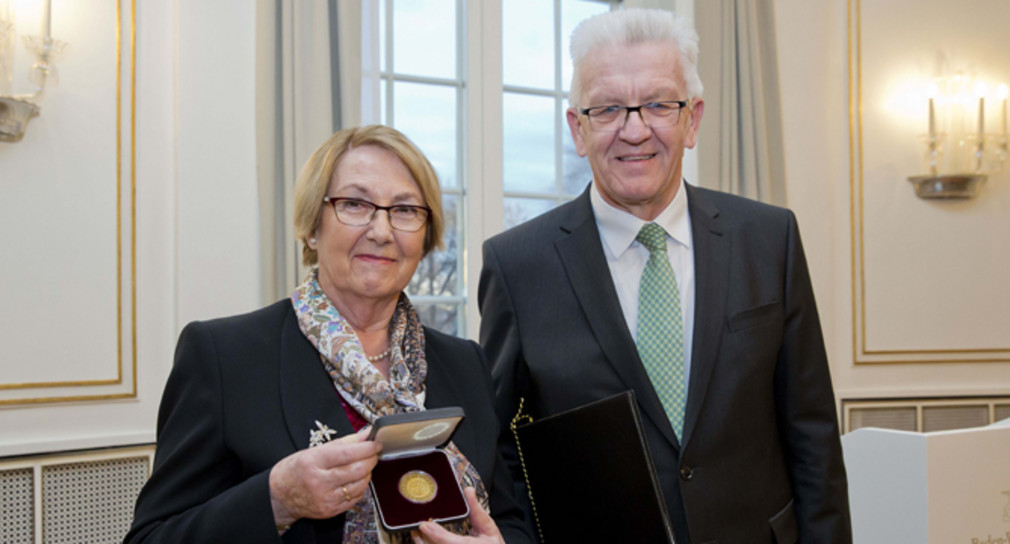 Ministerpräsident Winfried Kretschmann hat der ehemaligen Sozialministerin Barbara Schäfer-Wiegand die Große Staufermedaille in Gold des Landes Baden-Württemberg verliehen und ihren großen Einsatz für den sozialen Zusammenhalt in unserem Land gewürdigt.