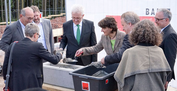 Ministerpräsident Winfried Kretschmann, der Minister für Umwelt, Klima und Energiewirtschaft Franz Untersteller und Finanzstaatssekretärin Gisela Splett haben auf dem Ruhestein den Grundstein für den Neubau des Besucher- und Informationszentrums (BIZ) und des Verwaltungsgebäudes für den Nationalpark Schwarzwald gelegt.