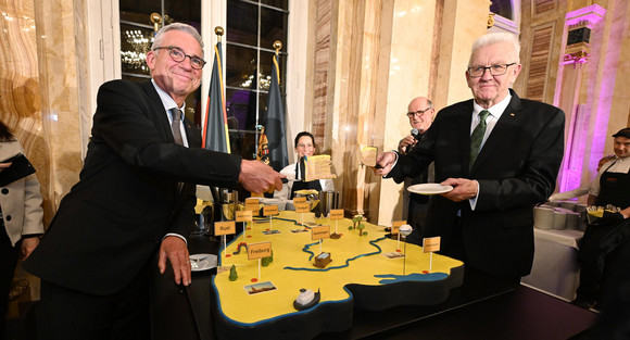 Rund 750 Gäste hatten auf Einladung des Ministerpräsidenten den Weg ins Neue Schloss gefunden und tauschten sich mit den Mitgliedern der Landesregierung aus. Das Rahmenprogramm bildeten vielfältige künstlerische Beiträge: Das „Magnus-Mehl-Blechbläsertrio“, das „Barockensemble Studio 16“, „Der wunderbare Frauenchor Stuttgart“ und das Duo Kraus/Sinz an Saxophon und Klavier musizierten an verschiedenen Orten im Mitteltrakt des Neuen Schlosses. Die Digitalagentur B-Rex aus Stuttgart begeisterte mit virtuellen Erlebnissen und schickte die Gäste als Avatare in andere Welten.