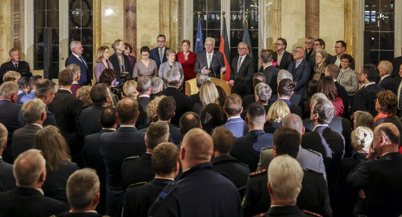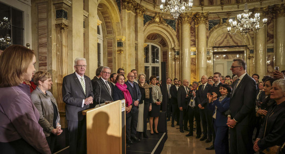 Unter dem Motto „Zum Schutze unseres Landes“ begrüßte Ministerpräsident Winfried Kretschmann rund 650 Gäste beim Neujahrsempfang der Landesregierung am Freitag, 17. Januar 2025. Eingeladen waren vor allem Menschen, die im Katastrophen- und Bevölkerungsschutz aktiv sind. "Mitmenschlichkeit, Solidarität und Hilfsbereitschaft sind Ausdruck einer humanen Gesellschaft. Wir können uns froh und glücklich schätzen, dass es bei uns in Baden-Württemberg außergewöhnlich viele engagierte Bürgerinnen und Bürger gibt. Sie schaffen Zusammenhalt“, hob der Ministerpräsident im Neuen Schloss in Stuttgart hervor.