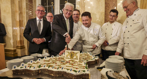 Beim anschließenden Empfang stand der Austausch des Ministerpräsidenten und der Mitglieder der Landesregierung mit den Gästen im Mittelpunkt. Das Rahmenprogramm bildeten musikalische und künstlerische Beiträge des Holzbläser-Quintetts des Landespolizeiorchesters, der St. Georgs Chorknaben Ulm unter Thomas Stang, des SchiBu-Duos und des Saxophon-Quartetts Sax 3.1.