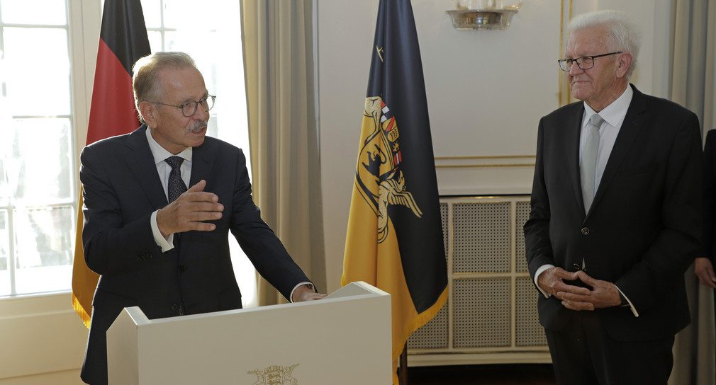 Ministerpräsident Winfried Kretschmann hat den Unternehmer Franz Fehrenbach im Rahmen eines Empfangs geehrt. Anlass war Fehrenbachs Berufung in die Hall of Fame der deutschen Wirtschaft.