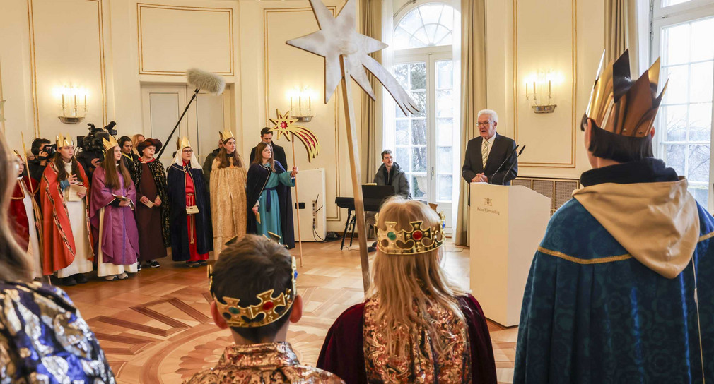 „Das Dreikönigssingen in Deutschland ist die weltweit größte Hilfsaktion von Kindern für Kindern“, sagte Ministerpräsident Winfried Kretschmann am Montag, 13. Januar 2025, beim Empfang der Sternsingerinnen und Sternsinger im Staatsministerium in Stuttgart. Das Motto der Aktion Dreikönigssingen 2025 lautete: „Erhebt eure Stimme! – Sternsingen für Kinderrechte“. Der Ministerpräsident betonte: „Kinder haben Rechte. Doch diese werden leider nicht wie selbstverständlich überall umgesetzt. Die Sternsingerinnen und Sternsinger helfen Kindern, indem sie ihre Stimme für ihre Rechte erheben. Sie senden damit eine tolle Botschaft aus und füllen sie mit Leben. Mit den Spenden, die sie sammeln, wird Kindern auf der ganzen Welt ein wenig Licht und Hoffnung gebracht.“ Er dankte den Sternsingerinnen und Sternsingern von Herzen für ihr Engagement.