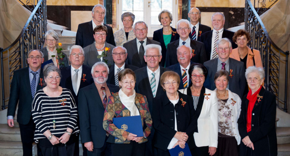 „Demokratie lebt nicht vom Zuschauen, sondern vom Mitmachen. Kirche, Feuerwehr und Wohlfahrt, Vereine, Nachbarschaftshilfe, Parteien, Initiativen, Verbände, aber auch Gemeinderäte und Kreistage – sie alle wären ohne das freiwillige Engagement von Bürgerinnen und Bürgern nicht denkbar“, so Ministerpräsident Winfried Kretschmann bei der Überreichung des Verdienstkreuzes am Bande an 22 Bürgerinnen und Bürger anlässlich des Tages des Ehrenamtes in Stuttgart.