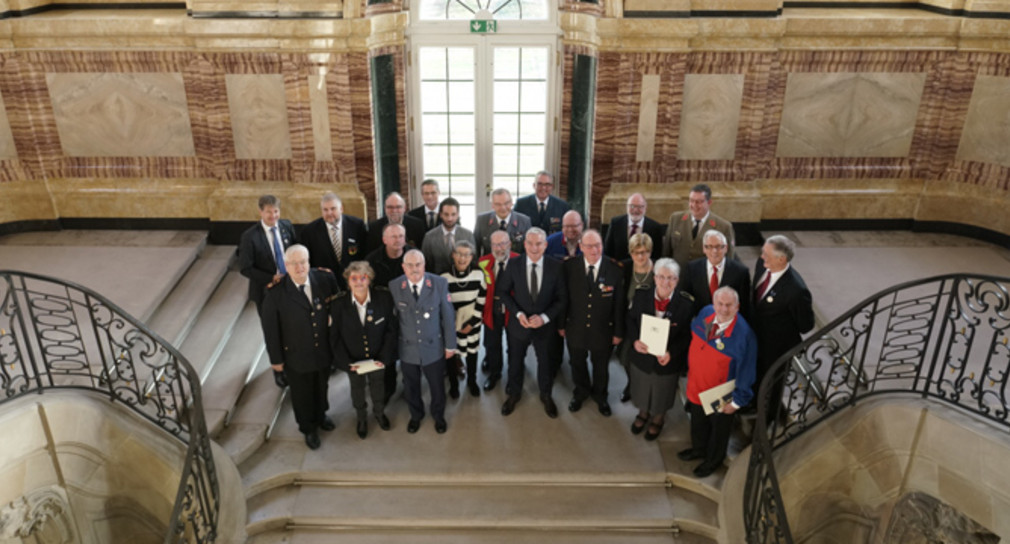 Das Land hat zum ersten Mal das Bevölkerungsschutz-Ehrenzeichen verliehen. Die Ehrung gilt Personen, die sich in besonderer Weise um den Bevölkerungsschutz verdient gemacht haben oder die besonders mutiges und entschlossenes Verhalten im Bevölkerungsschutzeinsatz gezeigt haben.