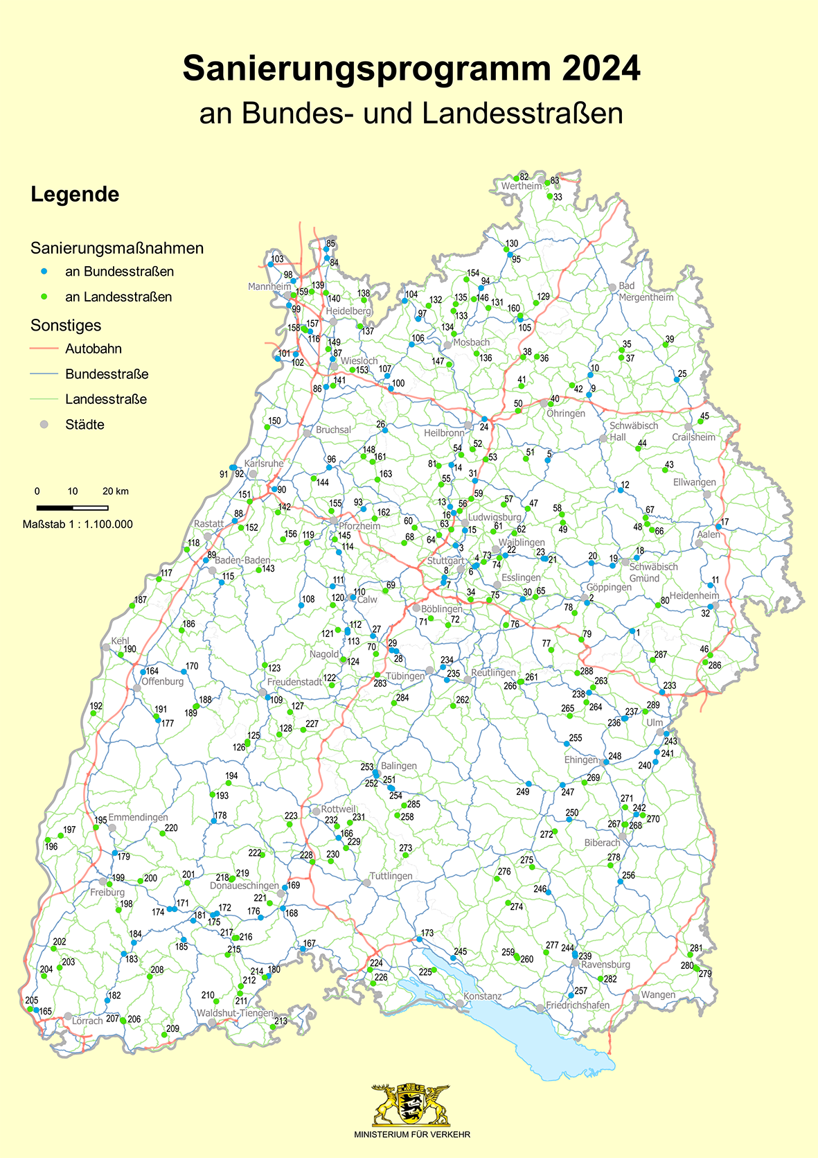 Der Bund stellt in diesem Jahr voraussichtlich rund 221 Millionen Euro für die Erhaltung des Bundesstraßennetzes Baden-Württemberg zur Verfügung. Das Land investiert im Jahr 2024 voraussichtlich rund 165 Millionen Euro zur Erhaltung des Landesstraßennetzes Baden-Württemberg. Auf dieser Grundlage umfasst das Sanierungsprogramm 2024 landesweit mehr als 150 Erhaltungsmaßnahmen (FDE-Maßnahmen), bei denen vor allem die Erneuerung der Fahrbahndecke im Vordergrund steht. In diesem Jahr ist an Bundesstraßen die Sanierung von mehr als 150 Kilometer Fahrbahnen sowie an Landesstraßen die Sanierung von knapp 250 Kilometer Fahrbahnen vorgesehen.