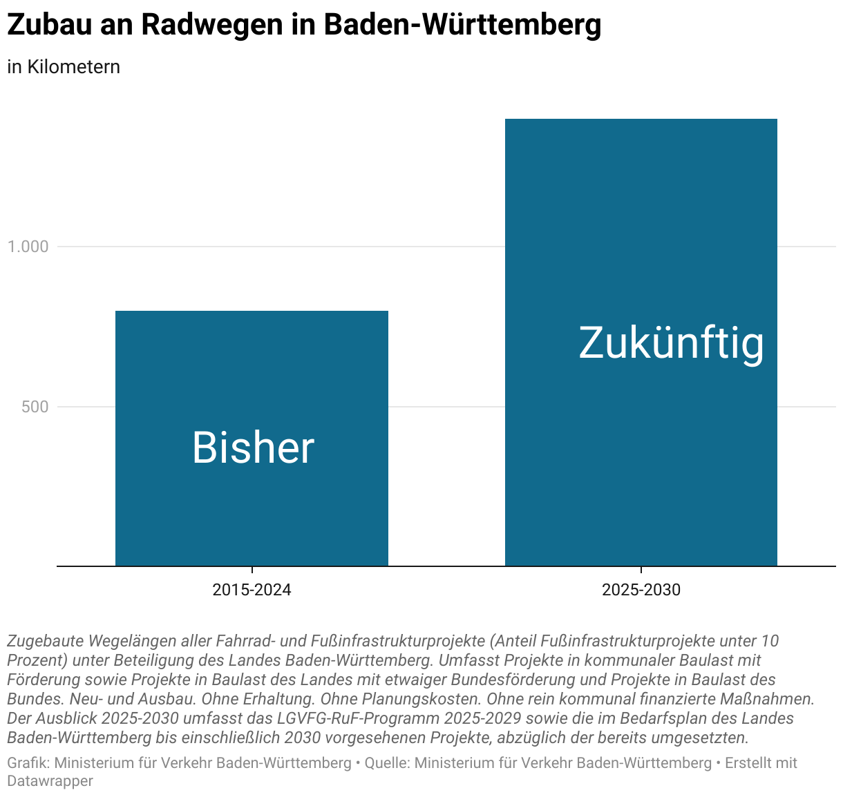 Der verstärkte Ausbau geht auch in den nächsten Jahren weiter: Bis 2030 sollen weitere 1.400 Kilometer und 30.000 zusätzliche Fahrradabstellplätze entstehen. Allein das aktuelle Landesförderprogramm für den Rad- und Fußverkehr (2025 bis 2029) umfasst mehr als 1.000 kommunale Projekte mit einer Gesamtinvestition von über einer Milliarde Euro.