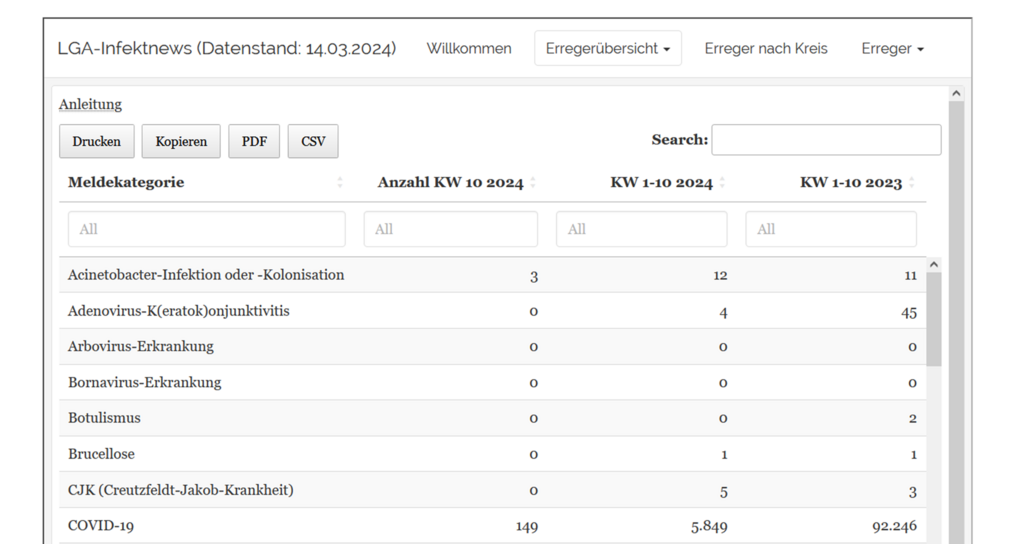 Baden-Württemberg ist eines der ersten Bundesländer, das für alle Infektionserreger ein gemeinsames Dashboard aufgebaut hat. Die Daten werden wöchentlich aktualisiert und können auf Kreisebene gefiltert werden.