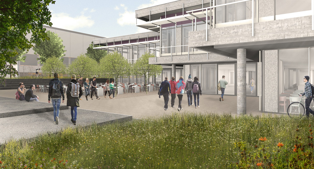 Das Bestandsgebäude ist etwa 4.100 Quadratmeter groß. Auf einer Fläche von rund 2.600 Quadratmetern wird es im Erdgeschoss eine Menseria geben, bestehend aus einer Mensa und einer Cafeteria. Der großzügige Außensitzbereich und die ganztägig geöffnete Cafeteria bilden die neue Mitte des Hochschulcampus. Hier entsteht ein öffentlicher Platz mit einer hohen Aufenthaltsqualität. Im Erdgeschoss werden außerdem Anlieferung, Lagerung, Produktionsküche, Essensausgabe samt Rückgabe und Spülbereich betriebseffizient angeordnet.