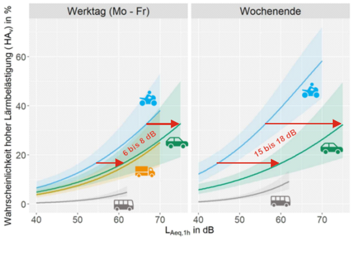Die Studie zeigt, dass Motorräder deutlich häufiger als belästigend wahrgenommen werden als gleich laute Pkw und auch Lkw. Beispielsweise empfinden 50 Prozent der Befragten am Wochenende Motorräder als belästigend, wenn diese einen Pegel von 70 dB(A) erreichen. Bei gleich lauten Pkw empfinden dies nur 20 Prozent. Auf Basis der Ergebnisse wurde ein sogenannter Lästigkeitszuschlag ermittelt. Dieser beschreibt die zusätzliche Belästigung, die durch die besondere Geräuschcharakteristik von Motorradlärm über ihre objektiv gemessene Lautstärke hinaus entsteht. Sie beträgt - in der Messgröße für Lärm Dezibel (dB) ausgedrückt - an den Werktagen Montag bis Freitag 6 bis 8 dB und an den Wochenenden sogar 15 bis 18 dB (siehe Abbildung). In den Ergebnissen spiegelt sich auch das höhere Erholungsbedürfnis der Menschen an Wochenenden wider.