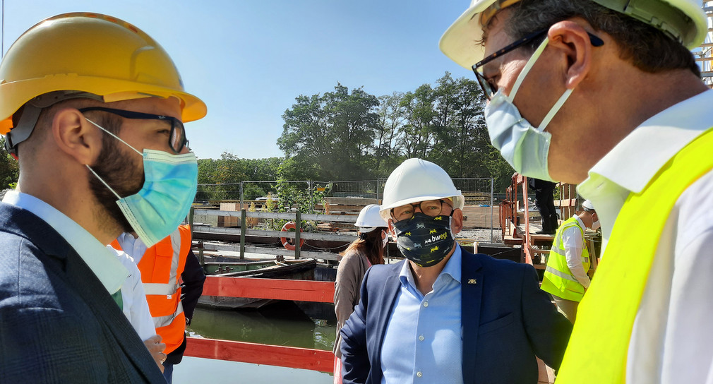 Im Rahmen seiner Sommertour hat Verkehrsminister Winfried Hermann die Neckarschleuse Feudenheim in Mannheim besucht und sich sich über den Schleusenausbau informiert.