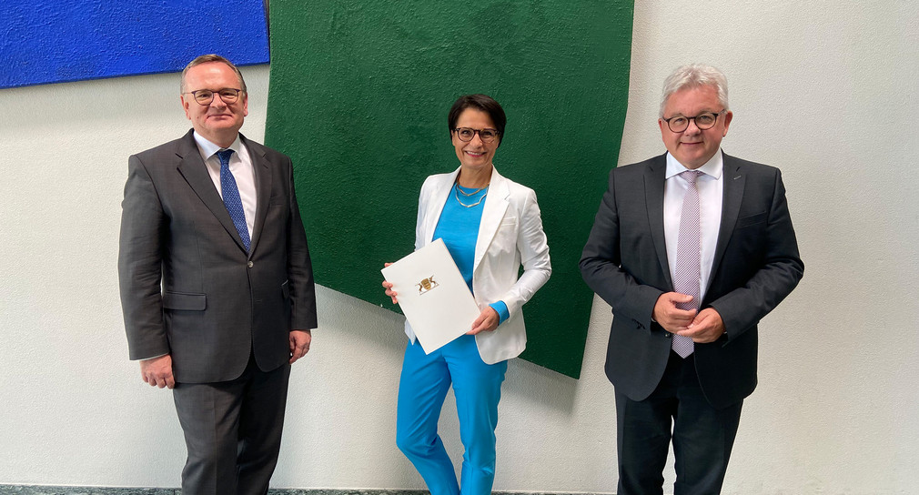 Dorothee Wahle ist die neue Präsidentin des Amtsgerichts Freiburg. Justizminister Guido Wolf und Ministerialdirektor Elmar Steinbacher gratulierten ihr zur Ernennung.