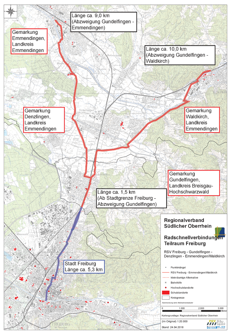 Bis 2025 sollen in Baden-Württemberg zehn Radschnellwege realisiert werden. Bund und Land stellen den Kreisen und Kommunen dazu Förderungen von über 80 Prozent zur Verfügung. Die rund 21 Kilometer langen Teilstrecken ab der Stadtgrenze Freiburgs bis nach Waldkirch und Emmendingen plant und baut das Regierungspräsidium als Landesprojekt. Für die fünf Kilometer lange Etappe auf dem Stadtgebiet trägt die Stadt Freiburg die Baulast. Um Flächen zu sparen, sollen möglichst viele bestehende Wege verwendet werden.
