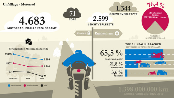 Die Anzahl der Motorradunfälle ging zurück. So ereigneten sich im Jahr 2020 insgesamt 4.683 Motorradunfälle (2019: 4.887; -4,2 Prozent). Hierbei verstarben 23 Motorradfahrerinnen und -fahrer weniger als im Jahr 2019 (-24 Prozent). „Unser Fünf-Punkte-Plan zur Bekämpfung von Motorradunfällen hat auch in der Motorradsaison 2020 seinen Teil zur positiven Bilanz beigetragen“, so Minister Thomas Strobl.