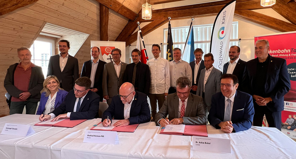 An der Vertragsunterzeichnung nahmen außerdem Landtagsvizepräsident Prof. Dr. Wolfgang Reinhart, die Bundestagsabgeordnete Nina Warken, die Landtagsabgeordneten Jan-Peter Röderer, Erwin Köhler und Klaus Ranger, die Bürgermeisterinnen und Bürgermeister der Kommunen an der Bahnstrecke, die Fraktionsvorsitzenden der beiden Kreistage sowie Vertreter der Bürgerinitiative „Frankenbahn für alle“ teil.