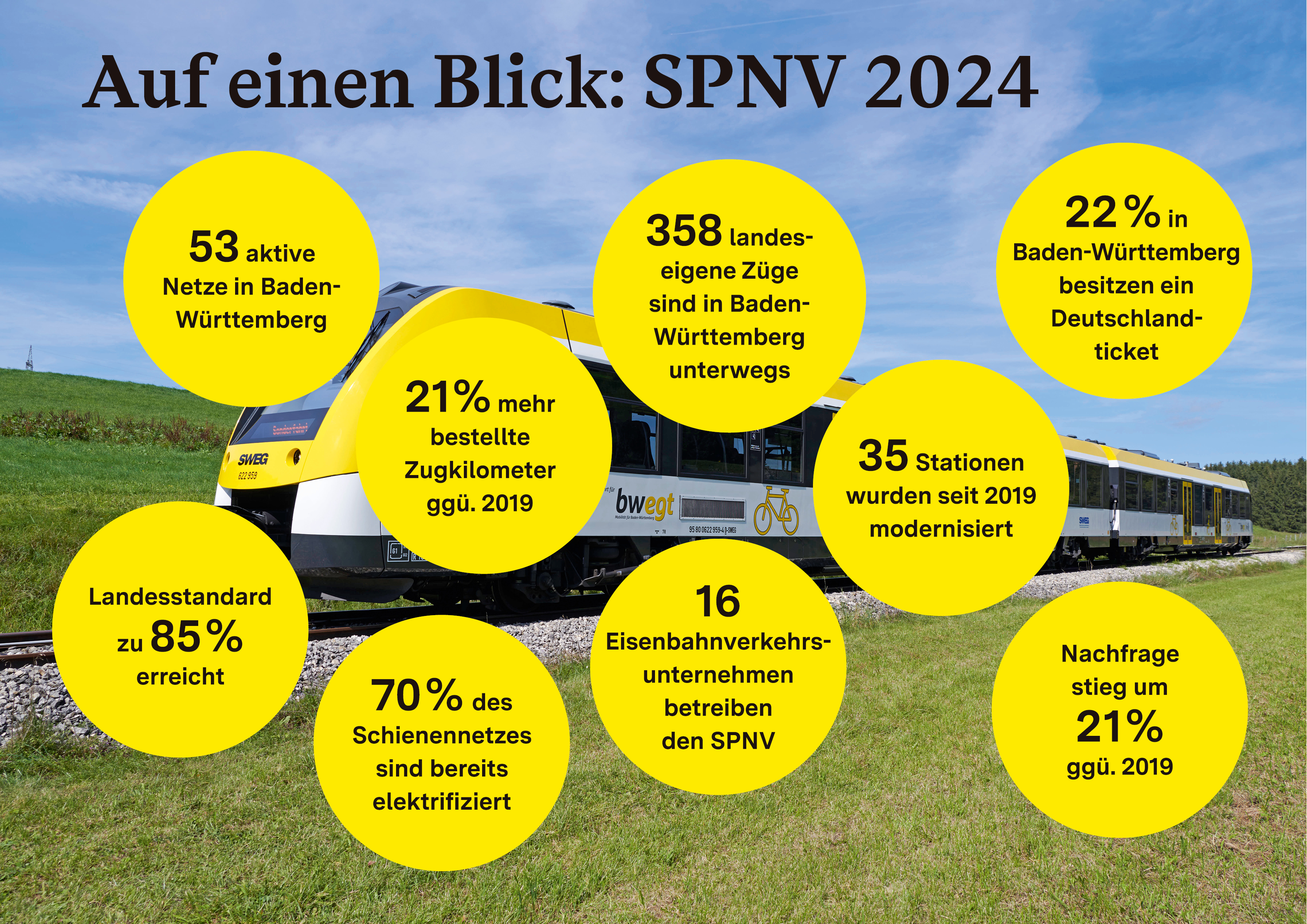 Mit über 88 Millionen Zugkilometern waren 2024 so viele Züge in Baden-Württemberg unterwegs wie nie zuvor; 100 Millionen inklusive der S-Bahn Stuttgart. Gleichzeitig erreichten die Fahrgastzahlen einen Rekord. Die im Regionalverkehr zurückgelegten Personenkilometer sind im Vergleich zu 2010 um 43 Prozent auf 6,2 Milliarden gestiegen und liegen damit 21 Prozent über dem Vor-Corona-Niveau von 2019. Seit der Bahnreform 1994 hat sich dieser Wert sogar verdreifacht.