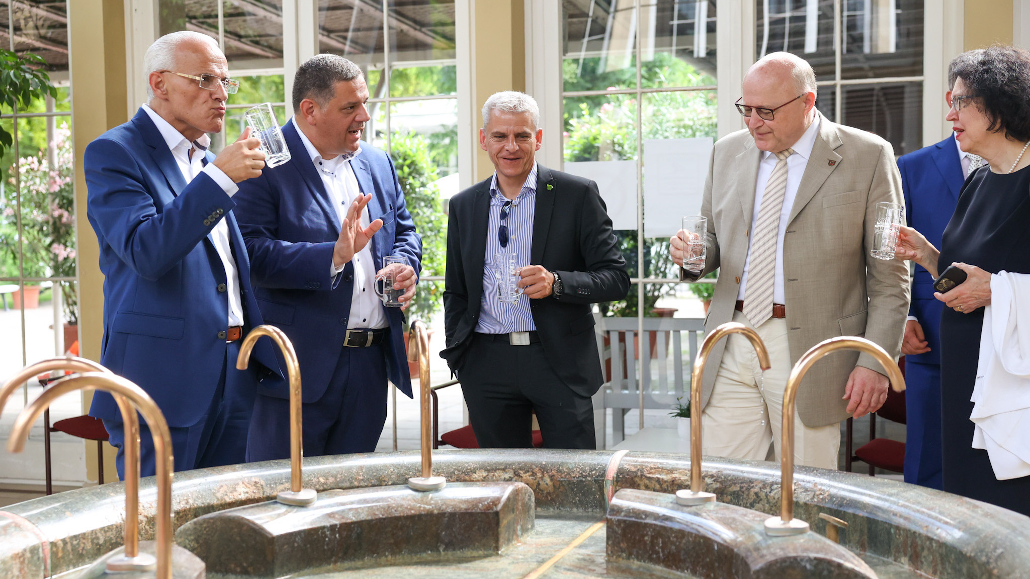 Start des zweiten Teils der Bäderrundreise war Bad Mergentheim, wo Dr. Patrick Rapp gemeinsam mit Oberbürgermeister Udo Glatthaar das Heilbad besichtigte. Unter der Führung von Kurdirektor Sven Dell ging es von der Kurverwaltung über den Kurpark bis zur Wandelhalle. Hier fand ein Austausch zur Gebäudehistorie der im Stil der Bauhauszeit gehaltenen Wandelhalle und den anstehenden Sanierungen zur Erweiterung der Nutzungsmöglichkeiten für Gäste und Einheimische statt. Bei der Verkostung der drei Heilquellen Bad Mergentheims und dem Besuch des Gradierpavillons, der als Einsatzort der vierten Quelle im Kurort dient, blickten die Teilnehmenden hinter die Kulissen des Gesundheitsstandorts.