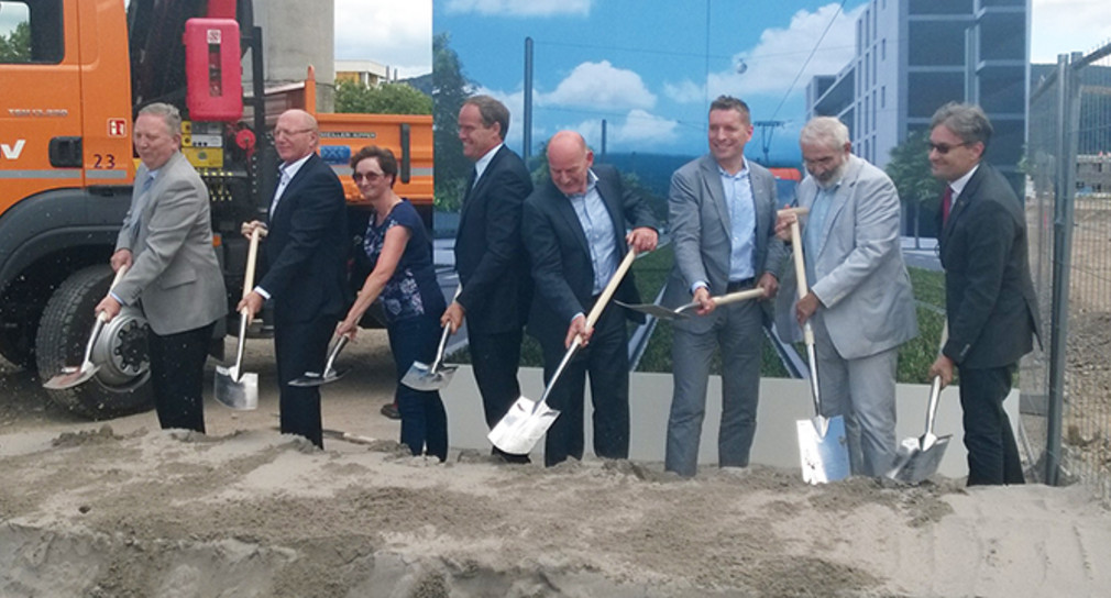 Der baden-württembergische Verkehrsminister Winfried Hermann, Heidelbergs Oberbürgermeister Dr. Eckart Würzner, der Technische Geschäftsführer der Rhein-Neckar-Verkehr GmbH (rnv) Martin in der Beek und Michael Jäger, Geschäftsführer der Heidelberger Straßen- und Bergbahn GmbH (HSB), gaben den offiziellen Startschuss für die Arbeiten an der neuen Trasse.