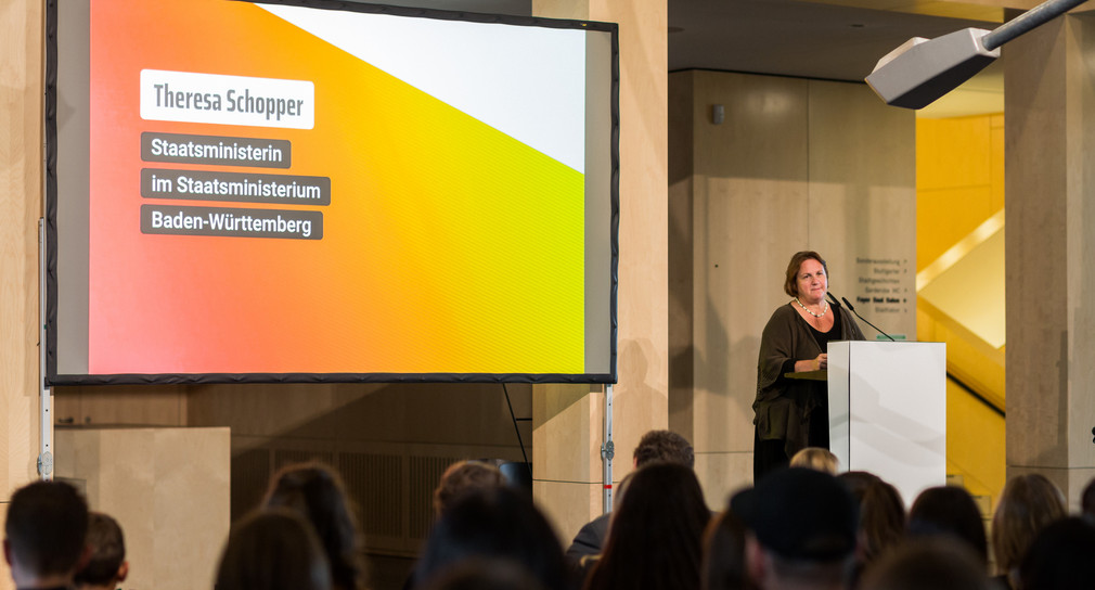 Nach dem Grußwort von Staatsministerin Theresa Schopper thematisierten die Landessendedirektorin Stefanie Schneider und die Journalistin Karolin Schwarz das Thema „Hass und Hetze im Netz“ im Rahmen ihres Fachvortrags. Im Anschluss daran diskutierten die beiden Journalistinnen gemeinsam mit Influencern und Leandro Karst, dem Vorsitzenden des Landesschülerbeirats.