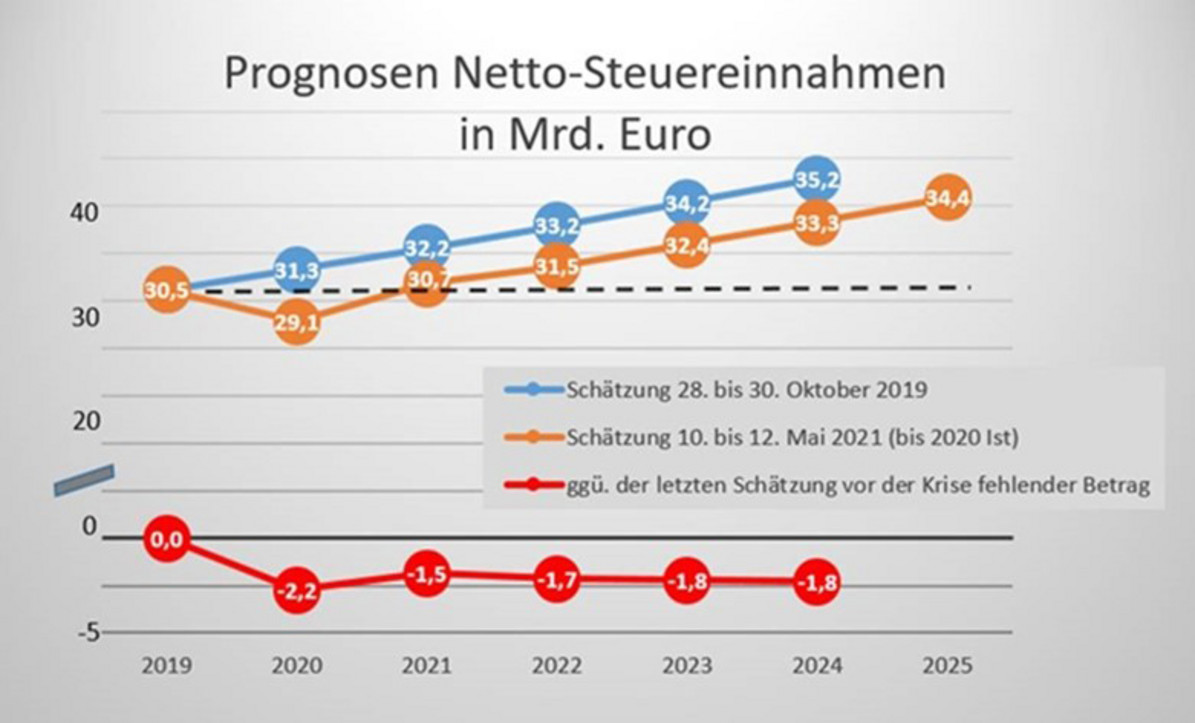 Für 2022 geht die Mittelfristige Finanzplanung 2020 bis 2024 von Steuereinnahmen in Höhe von 30,99 Milliarden Euro aus, die Mai-Steuerschätzung liegt nun bei 31,46 Milliarden Euro (plus 466 Millionen Euro). 2023 könnte das Plus 482 Millionen Euro betragen: Die Mittelfristige Finanzplanung setzt Netto-Steuereinnahmen von 31,91 Milliarden Euro an, die Steuerschätzung ergibt 32,39 Milliarden Euro.