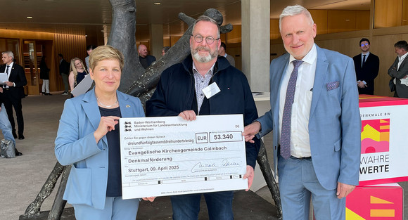 Die Ministerin für Landesentwicklung und Wohnen, Nicole Razavi, überreichte im Stuttgarter Landtag symbolische Schecks an fünf Denkmaleigentümerinnen und -eigentümer aus Baden-Württemberg. Das Land unterstützt sie bei der Sanierung ihrer Kulturdenkmale jeweils mit einer Förderung im Rahmen der ersten Tranche des Denkmalförderprogramms 2025.