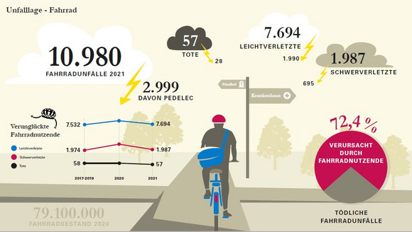 Die Anzahl der Fahrradunfälle (-11,5 Prozent) und der verletzten Fahrradfahrerinnen und Fahrradfahrer ging deutlich zurück (-12,0 Prozent). Die Zahl der 57 getöteten Radfahrerinnen und Radfahrer beweget sich auf dem Vorjahresniveau (2021: 58). Jede zweite getötete Radfahrerin und Radfahrer war dabei mit einem Elektrofahrrad unterwegs (28 von 57).