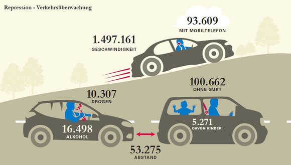 „Die Verkehrsüberwachung ist gezielt auf die Hauptunfallursachen schwerster Verkehrsunfälle ausgerichtet. Sie ist eine polizeiliche Kernaufgabe und dient dem Schutz von Menschenleben im Straßenverkehr. Denn der Wirkzusammenhang zwischen Kontrolldruck, Sanktionshöhe und Verhaltensänderung ist wissenschaftlich erwiesen. Es geht schlicht um Menschenleben", betonte Innenminister Thomas Strobl. Im vergangenen Jahr wurden allein durch die Polizei knapp 1,5 Millionen Geschwindigkeitsverstöße festgestellt. Darüber hinaus wurden rund 27.000 Personen wegen Fahrens unter Alkohol-, Drogen-, oder Medikamenteneinfluss sowie rund 94.000 Verstöße wegen unerlaubter Handy-Nutzung zur Anzeige gebracht. Hinzu kommen rund 100.000 Gurtverstöße (inklusive fehlender Kindersicherung).