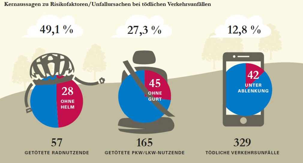 Die Teilnahme am Straßenverkehr erfordert die komplette Aufmerksamkeit. Das zeigt sich daran, dass 2021 bei 42 von insgesamt 329 tödlichen Verkehrsunfällen Ablenkung unfallursächlich war. Weiterhin hatten 45 der getöteten gurtpflichtigen Nutzerinnen und Nutzer von Fahrzeugen den Sicherheitsgurt zum Unfallzeitpunkt nicht beziehungsweise nicht ordnungsgemäß angelegt.