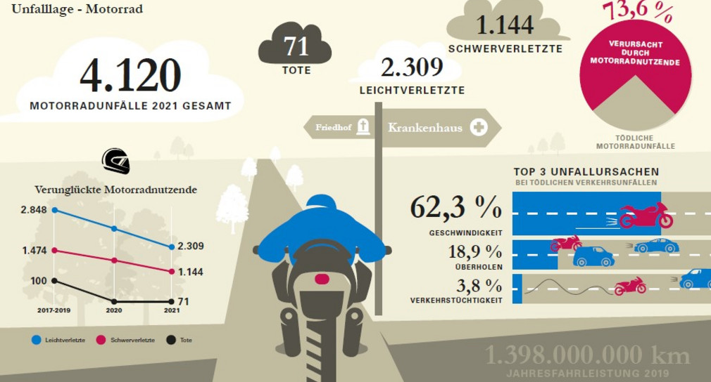 Im Bereich der Motorradunfälle hat sich die gute Bilanz der Motorradsaison auf das Gesamtjahr verstetigt. Dennoch war auch im Jahr 2021 jeder fünfte Verkehrstote mit dem Motorrad unterwegs. Im Zusammenhang mit Lastkraftwagen(Lkw)-Unfällen starben 83 Menschen und damit neun mehr als im Vorjahr. „Fast die Hälfte unserer Verkehrstoten verzeichnen wir weiterhin im Zusammenhang mit Motorrad- oder Lkw-Unfällen. Daher werden wir unseren Weg des 5-Punkte-Plans im Motorradbereich mit einer Überwachungsoffensive, verstärkter Prävention, kostenloser Technikchecks, einer offensiven Öffentlichkeitsarbeit und einer Entschärfung gefährlicher Strecken konsequent weitergehen. Auch den Schwerverkehr werden wir noch intensiver in den Fokus nehmen. Allein rund 74.000 polizeilich festgestellte Verstöße in 2021 zeigen, dass sich Lkw-Fahrerinnen und -Fahrer, aber auch Unternehmerinnen und Unternehmer besser an die Regeln halten sollten“, führte Innenminister Thomas Strobl aus.