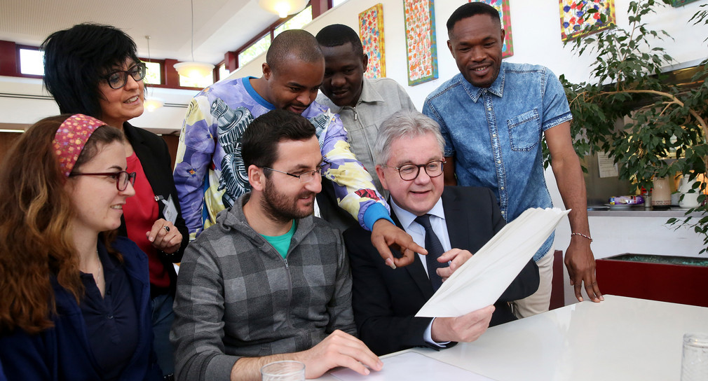 Minister Wolf bedankte sich bei Regierungspräsident Klaus Tappeser stellvertretend für alle Regierungspräsidien im Land, die in den Erstaufnahmeeinrichtungen die organisatorischen Voraussetzungen für den Rechtsstaatsunterricht vorhalten. Außerdem würdigte er die hervorragende Zusammenarbeit mit dem Volkshochschulverband Baden-Württemberg.