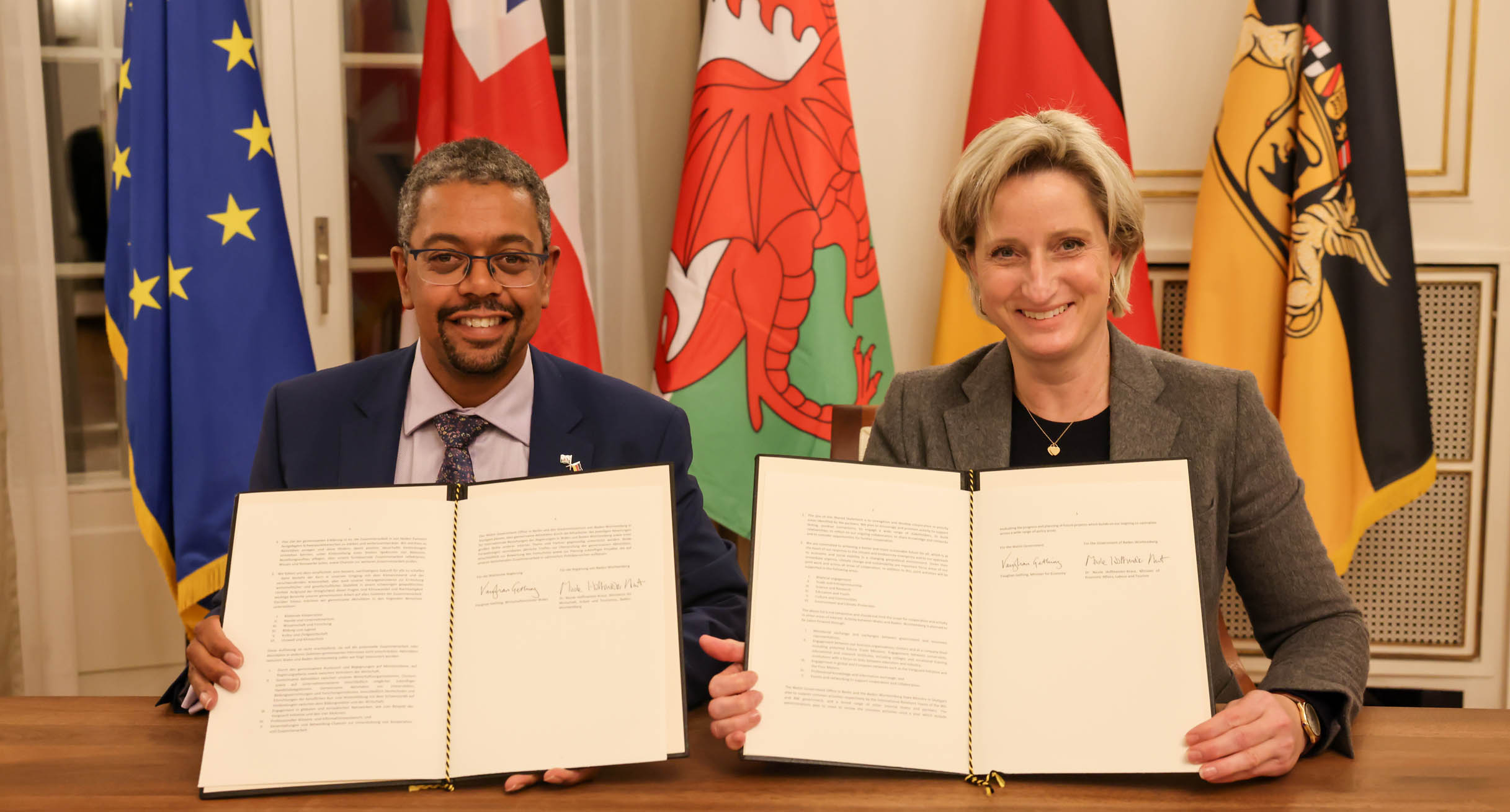 Wirtschaftsministerin Dr. Nicole Hoffmeister-Kraut hat den Förderbescheid an Prof. Michael Auer, den Vorstandsvorsitzender der Steinbeis-Stiftung, Prof. Gerhard Schneider, den Rektor der Hochschule Aalen,