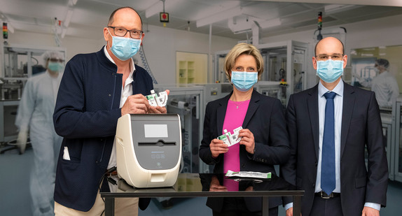 • Wirtschaftsministerin Nicole Hofmeister-Kraut (M.) mit Daniel Merk (l.) von der Spindiag GmbH bei der Vorstellung des PCR-basierten Corona-Schnelltests