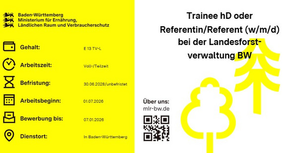 Als Dienstleister für Betreuung und sorgsame Waldbewirtschaftung setzt die Landesforstverwaltung die wirtschaftlichen, ökologischen und sozialen Ziele der Waldbesitzerinnen und Waldbesitzer mit dem Konzept der naturnahen Waldwirtschaft nachhaltig um. Gleichzeitig nimmt die Landesforstverwaltung die hoheitlichen Aufgaben auf allen Waldflächen in Baden-Württemberg wahr. Kommen Sie in unser Team als Trainee / Referent (w/m/d) für den höheren Forstdienst.